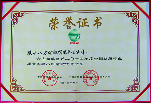 咸陽(yáng)紡織集團(tuán)下屬企業(yè)陜棉八廠榮獲“2014年度全國(guó)紡織行業(yè)質(zhì)量管理小組活動(dòng)優(yōu)秀企業(yè)”榮譽(yù)稱號(hào)